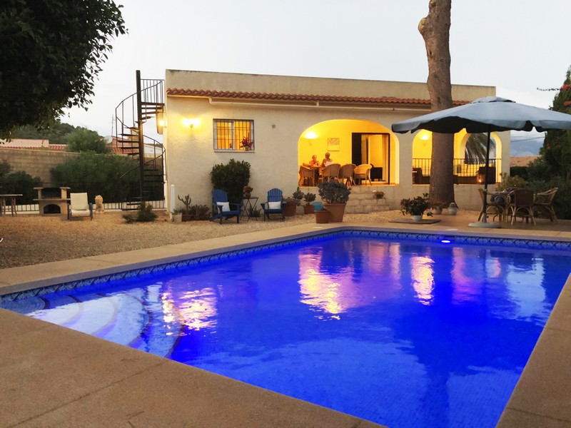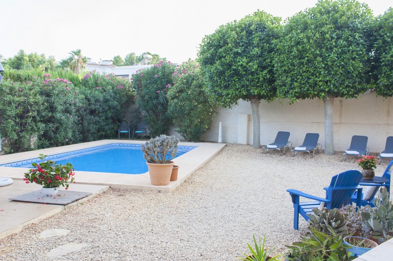 Het zwembad (8x4m) heeft een Romeinse inlooptrap en is omgeven met een mooi begroeide tuin met terrassen. De terrassen, met prachtige uitzichten op de heuvelruggen van de Sierra Bernia, Sierra Aitaina en Puig Campana, bevinden zich overdekt aan het huis, rond het zwembad en er is een dakterras met daar vandaan zeezicht.